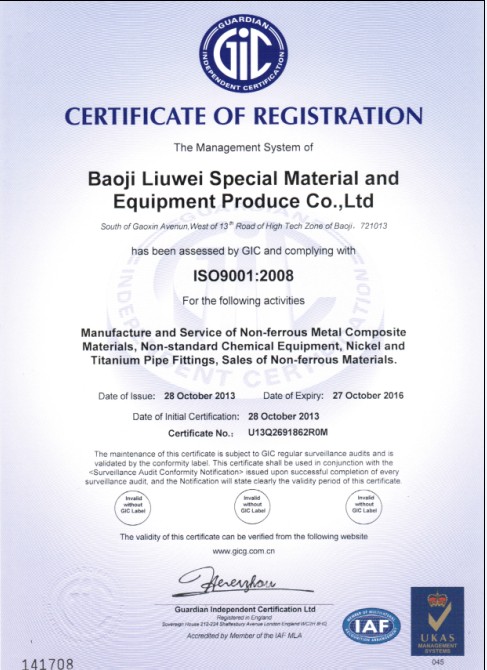 Baoji Liuwei Special Material And Equipment Produce Co., Ltd. > DOWN LOAD > Certifications > ISO9001:2008